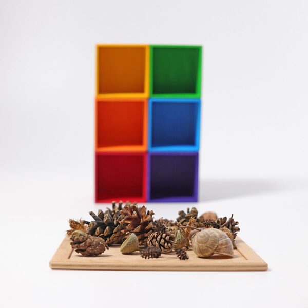 Hier können eure kleinen Künstler die bunten Mini-Pilze (Art. Nr. 10585), die leuchtenden Holzkugeln (10239), die schillernden Regenbogenschätze (10319), die schnuckeligen Holzspulen aus dem Fädelsielchen (10316) und die charmanten Figuren aus dem Sortierspiel Regenbogen (42125) eingeordnet.