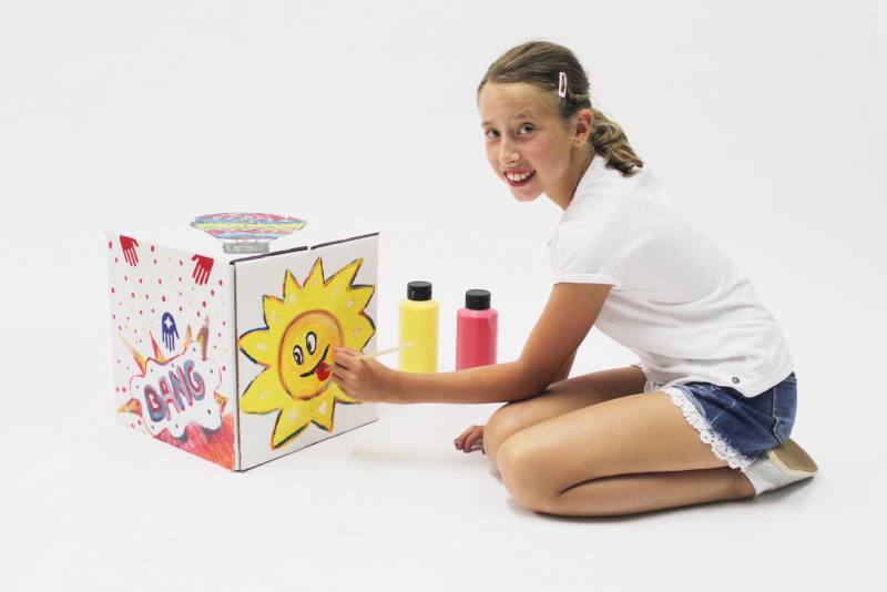 Sobald jedes Kind seinen Trommelhocker fertig bemalt hat, wird der Würfel aufgeklappt und ähnlich einfach wie ein Umzugskarton zusammengebaut.