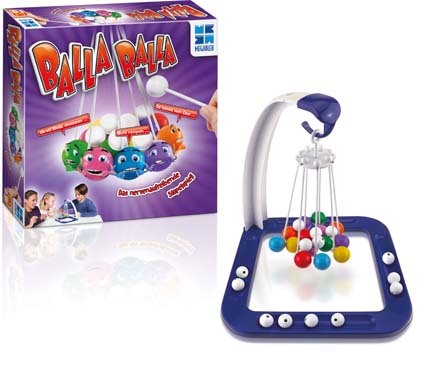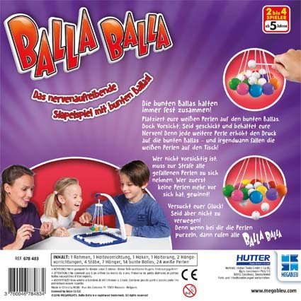 Artikelnummer: 12-678483 Kategorien: Hort, Spiel und Spaß, Spiele Schlagwörter: Geschicklichkeit, Hort, Kugel, SpielRote, blaue, gelbe, grüne – die bunten Ballas hängen cool ab und halten immer fest zusammen. Doch wieso bibbern die bunten Ballas so bitterlich? Über ihren Köpfen braut sich Unheil zusammen. Die Spieler platzieren Runde um Runde ihre weißen Kugeln auf der bunten Ballas-Traube. Hier ist Geschick gefragt, denn jede weitere Kugel erhöht den Druck auf die Ballas.