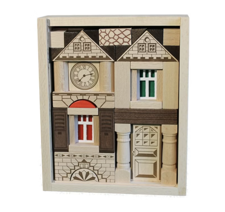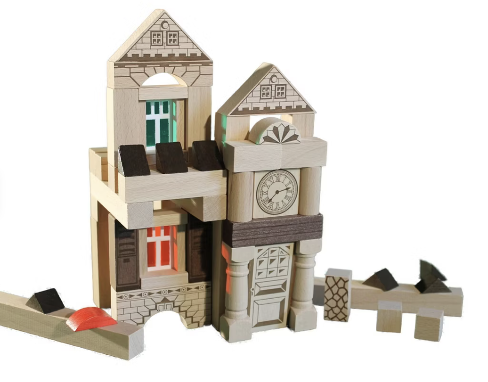 Dieser besondere Baukasten überzeugt mit gedrechselten Säulen, Fenstern und detailreichen, historisch inspirierten Drucken auf den Holzbausteinen.