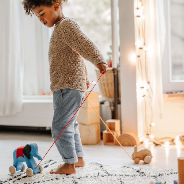 Sobald Kinder das Laufen gemeistert haben, ist es oft ihr Vergnügen, etwas hinter sich herzuziehen. In dieser Phase sind sie oft mit Otto, dem blauen Elefanten, unterwegs, einem wunderbaren Weggefährten!