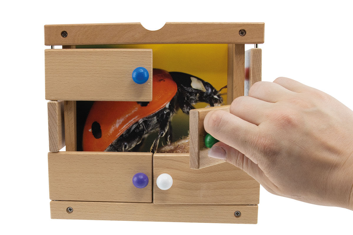 Die Kinder sind aufgefordert, die Bilder auf den Karten zu erraten. Im Laufe der Zeit öffnen sich die Türen des Holzgestells und das dahinterstehende Bild wird immer deutlicher.