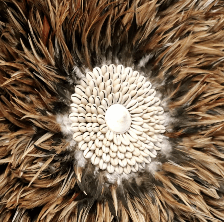 Wanddeko aus Federn und Muscheln