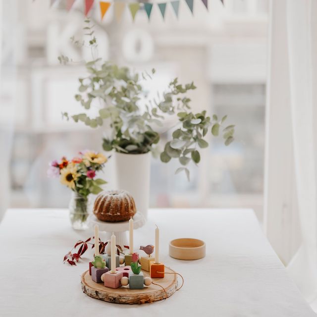 Artikelnummer: 06-01781 Kategorien: Deko/Geschenke, Kindergarten, Krippe Schlagwörter: Deko, Holz, Kindergarten, KIndergeburtstag, Krippe, Lindenholz farbig lasiert, mehrfarbig, Sozialverhalten, variable Stecker möglich, vielseitigFür den Geburtstagstisch sind die Geburtstagswürfel zum fädeln ein ganz besonders schöner Schmuck. Die Elemente können einzeln, in einer Reihe, im Bogen oder auch in Schlangenlinien aufgestellt werden. In die Löcher können Kerzen, in der Anzahl der vergangenen Lebensjahre gestellt werden. Ergänzend schmücken Figurenstecker, eine kleine Vase mit Blumen (Art. Nr 04700/04760) und/oder die Geburtstags-Zahl den Ring.