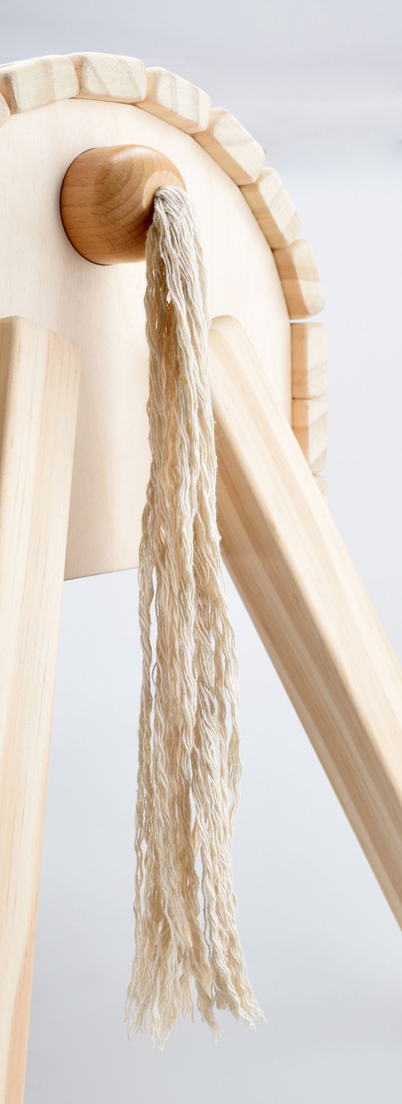 Das Pony ist aus Fichtensperrholz und der Schwanz ist aus Baumwolle. Die Augen, die Mähne und das Zaumzeug sind am Kopf angebracht.