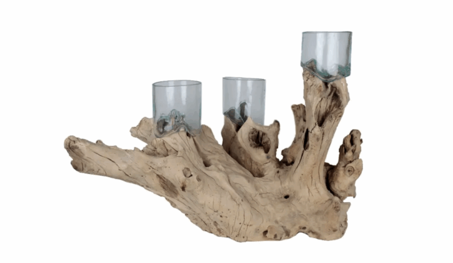 Liqva Holzwurzel mit 3 zylindrischen Gläsern