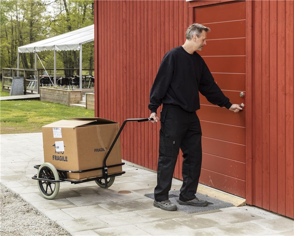 Handwagen mit vielfältigen Einsatzoptionen. Ein stabiles Gestell gewährleistet sicheren Transport der Lasten. Aus pulverbeschichtetem Stahl mit Holzauflage.