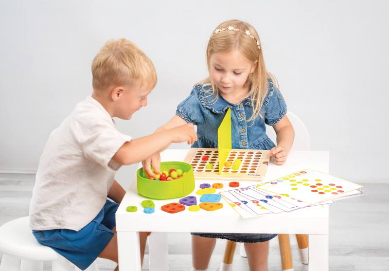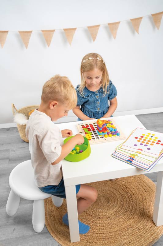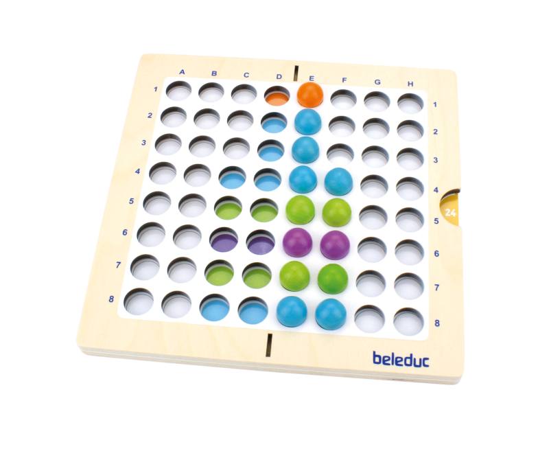 Grundlegende Fertigkeiten wie räumliches Denken, das Erkennen von Abfolgen und Mustern, das Verständnis von Symmetrie und die Feinmotorik werden dabei gefördert. Das aufgedruckte Koordinatennetz hilft bei der Orientierung.