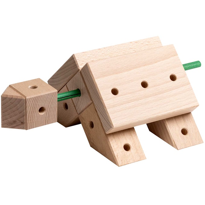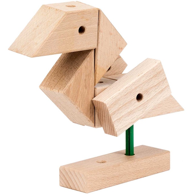 Bauelemente und Verbindungsstäbe werden mit Hammer, Zange und Keil gefügt. So bilden sich Fahrzeuge, Tiere, Figuren und Gebrauchsgegenstände nach Anleitung – oder ganz eigene Entwürfe. I