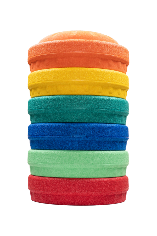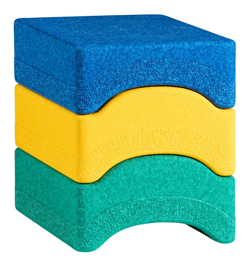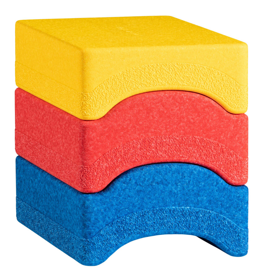 Sie sind pflegeleicht, einfach mit Wasser abwaschbar, vollständig recyclebar und vielseitig einsetzbar. Durch die beiden Formen – gewölbt und eben – lässt sich der Bewegungsparcours flexibel an die Fähigkeiten der Kinder anpassen.