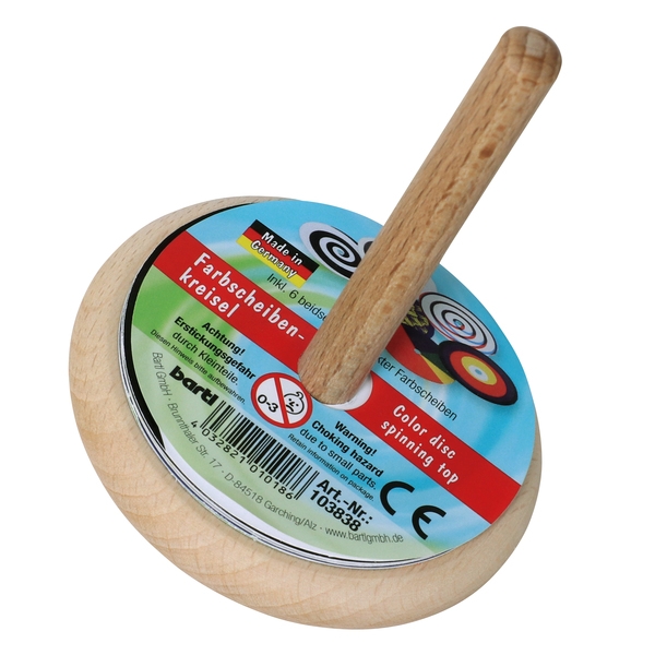Sechs beidseitig bedruckte Pappscheiben lassen den Kreisel in zwölf Farb- und Mustervariationen auf dem Tisch tanzen.