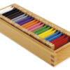 … Die Farbtäfelchen eröffnen Kindern ab 24 Monaten faszinierende Möglichkeiten, Farben spielerisch zu entdecken und zu erleben. Die Arbeit mit den Täfelchen schärft den Farbsinn, fördert die Konzentration und erweitert den Wortschatz, indem Kinder Farben erkennen, benennen und zuordnen. Zugleich verfeinern sie ihre Beobachtungsgabe, entwickeln ästhetisches Empfinden und trainieren ihre Intelligenz. Die methodische Arbeit mit den Täfelchen kann durch Drei-Stufen-Lektionen gezielt gefestigt werden, was den Lernprozess vertieft und die Freude an der Entdeckung der Farbwunder verstärkt. Jede Box ist aus hochwertigem Holz gefertigt und bietet eine praktische, übersichtliche Aufbewahrung. 6 Farbtäfelchen: 3 Paare in rot, gelb, blau.