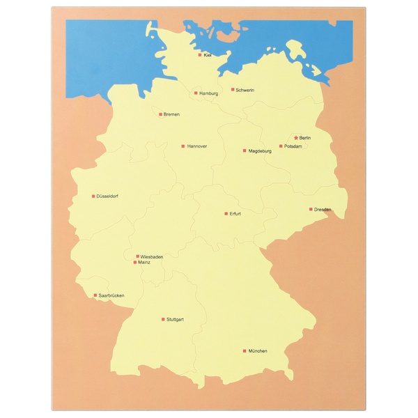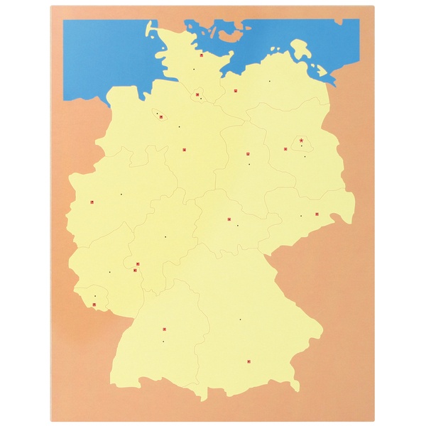 Mit dem Material lernt man die Bundesländer Deutschlands und deren Hauptstädte kennen. Die Holz-Kommode beinhaltet vier Landkarten aus Holz und drei Kunststoffboxen mit Fähnchen.