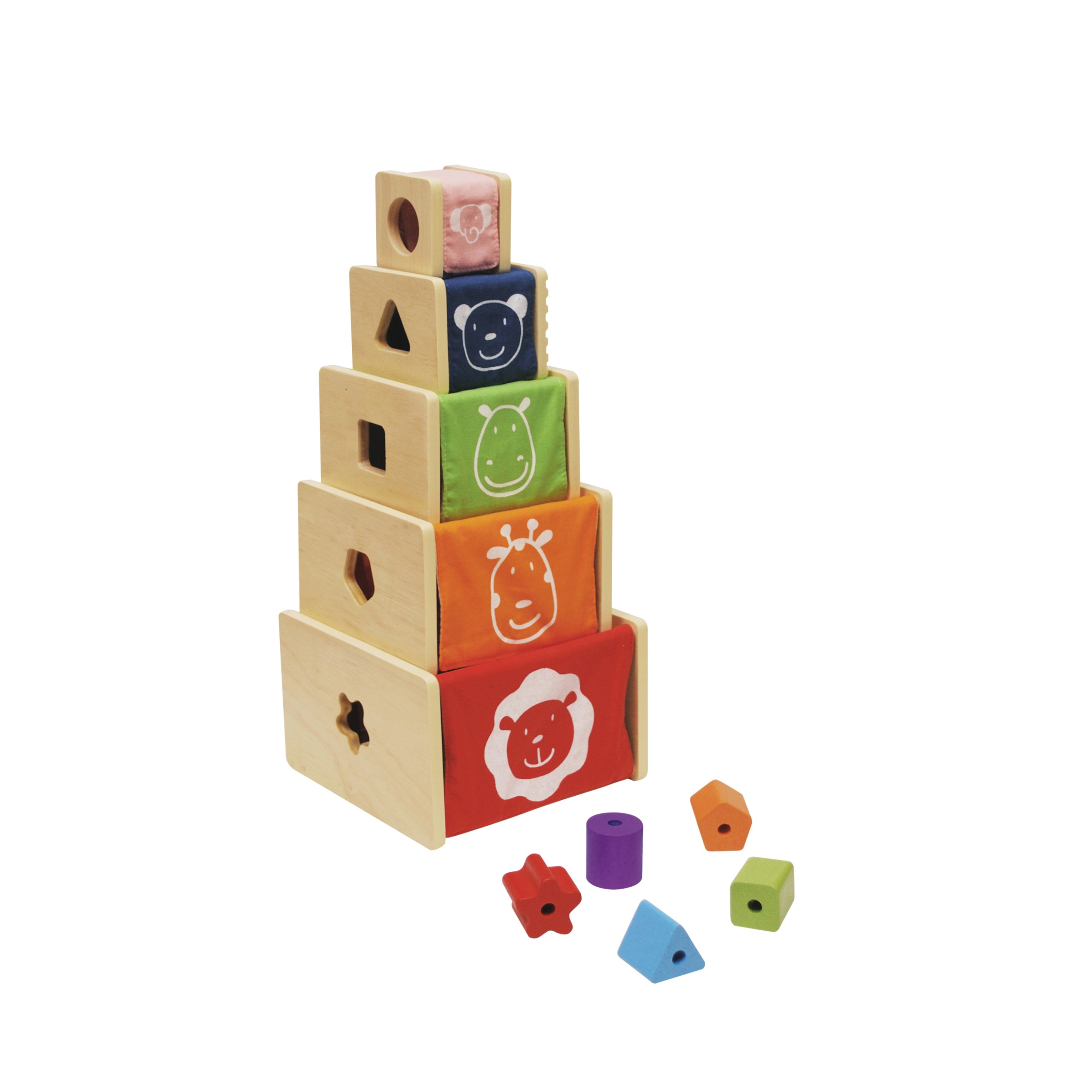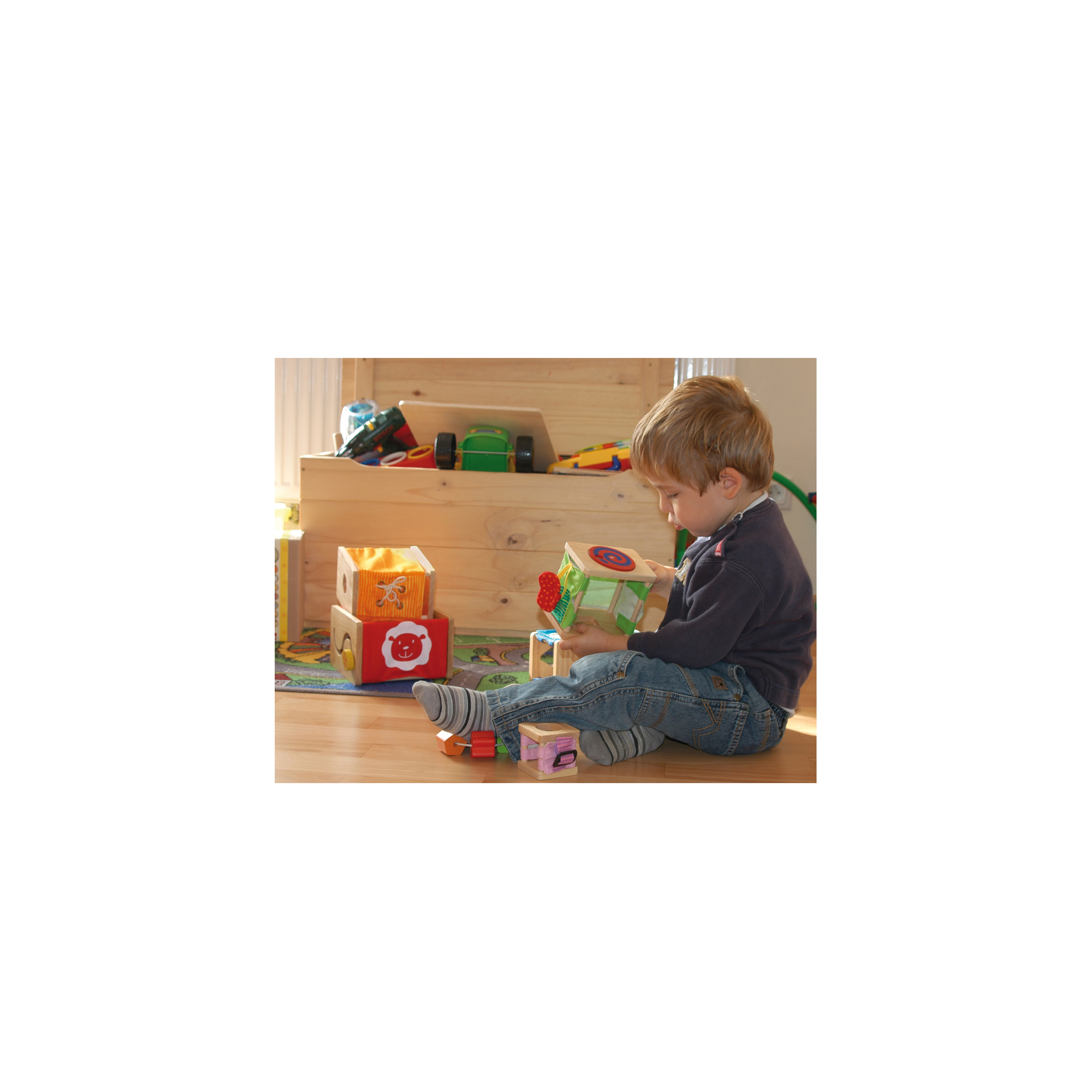 Fünf multifunktionelle Spielkisten in verschiedenen Größen im Set. Die Holzkisten mit Stoffelementen laden zum Lernspielen ein: Kinderspiegel, Formensortierspiel, Fädelspiel, Motorikschleife, Drehscheibe, Waschbrett, Übungen des praktischen Lebens (Gürtel schließen, mit weichen und harten Knöpfen arbeiten, Schuhe binden und Reißverschluss zumachen). Man kann die Kisten aufeinander stapeln oder, zum Aufbewahren, ineinander stecken. Ab 18 Monaten. Größte Kiste: 17 x 17 x 11 cm.
