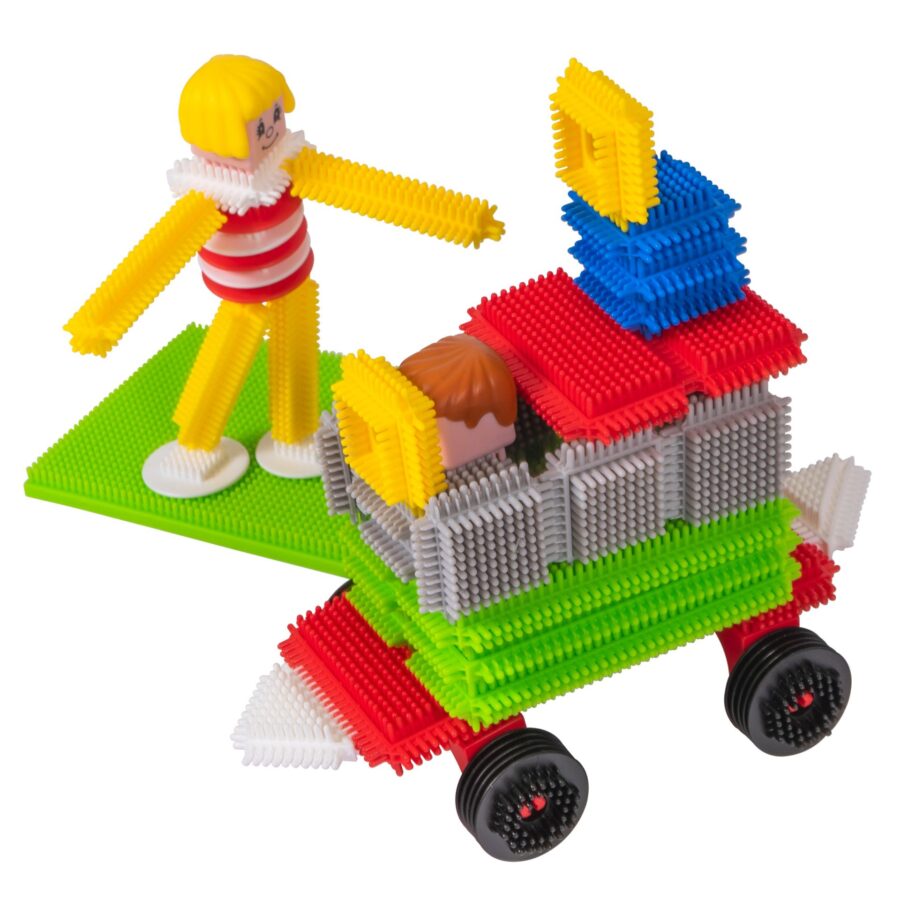 Enthält: 188-teiliges Noppisteck-Set, inkl. 8 Achsen mit Rädern, 12 Einzelräder, Figuren u.v.m