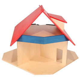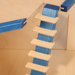 - Treppe und Balkon blau gebeizt. Dach rot gebeizt.