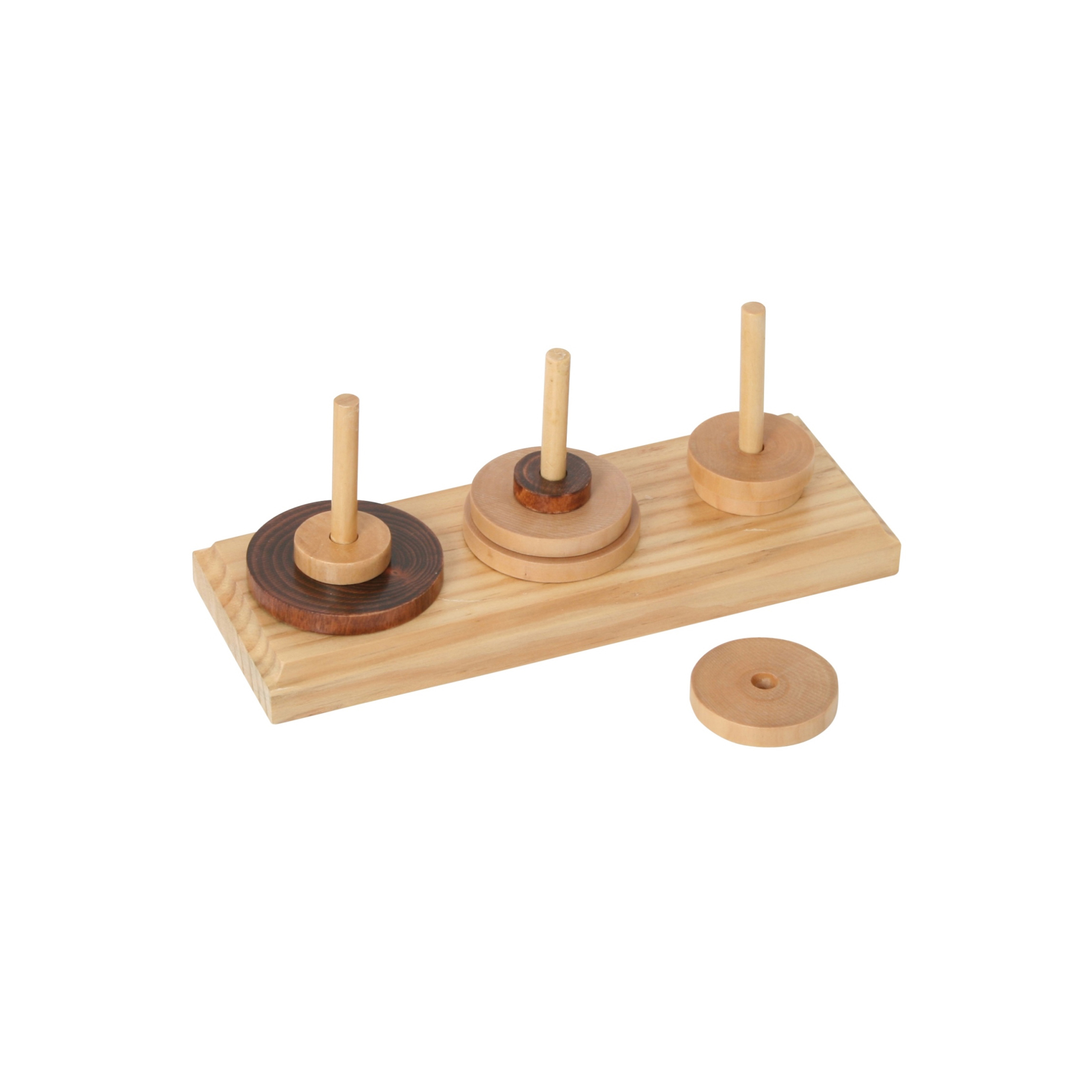 Wer den Turm schnellstmöglich von einem auf ein anderes Stäbchen verlagert, gewinnt. Dabei darf man aber immer nur ein Scheibchen bewegen und es darf auch kein größeres Scheibchen über einem kleineren liegen.