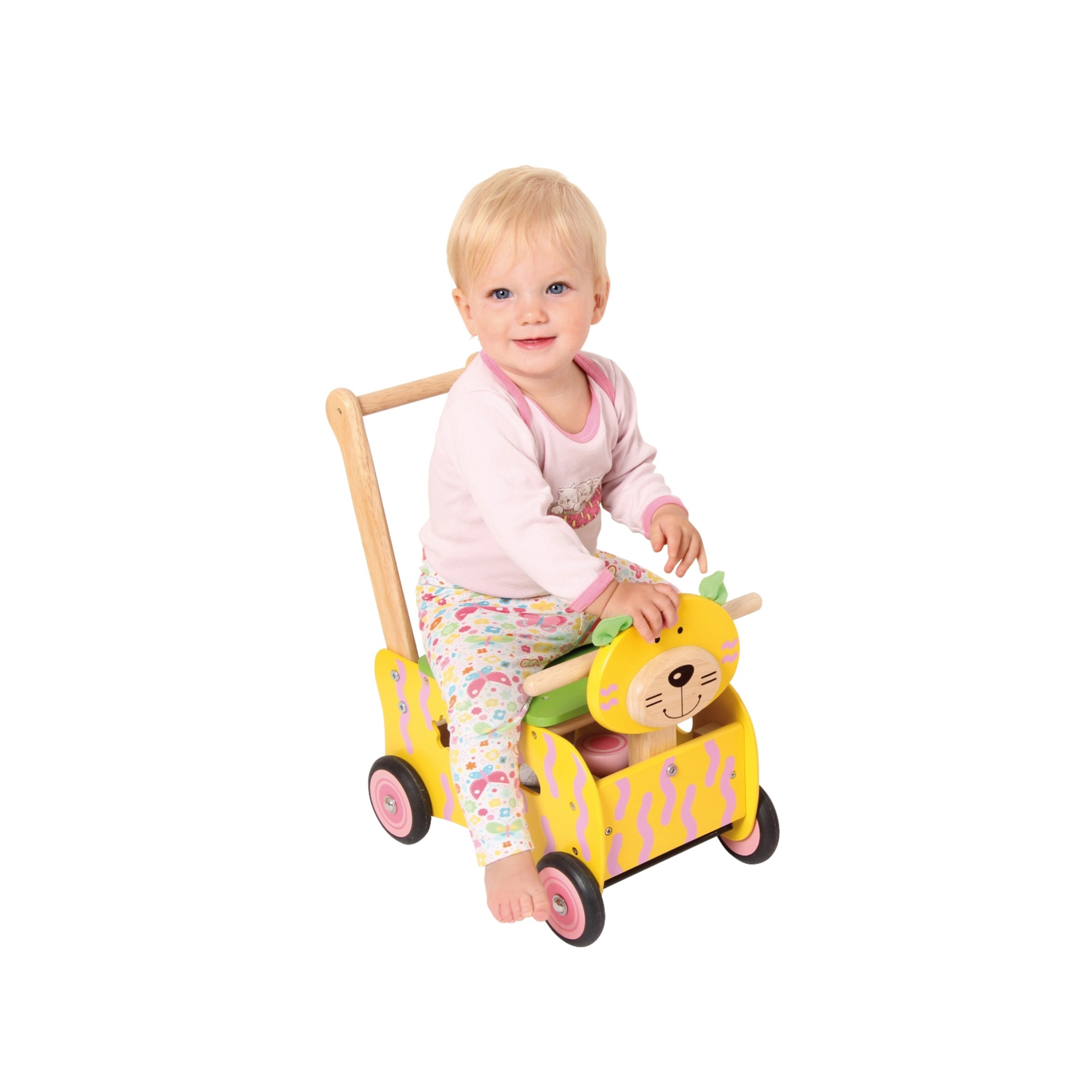 Stabiler Spielwagen aus Holz im Tier-Design. Das multifunktionelle Gefährt hat einen Griffbügel, eine abnehmbare Ablage- und Sitzfläche sowie ein Formensortierspiel in den Seitenteilen. Inklusive sechs Bauklötzen für das Sortierspiel und einer kleinen Spiel-Katze, die man am Schwänzchen des Schiebewagen-Tieres festmachen und hinter sich herziehen kann. Kleine Kinder können auf dem Wagen sitzen oder ihn als Rutscher verwenden.