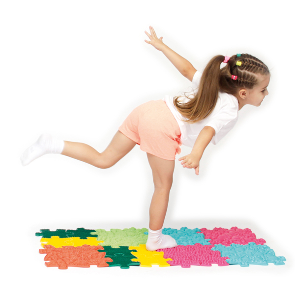 … In der Natur ertasten Kinder mit ihren Händen und Füßen unterschiedliche weiche und harte Oberflächen beim Schlendern, Laufen, Krabbeln und Rutschen. Dabei machen sie Erfahrungen, die existenziell wichtig für ihre Entwicklung sind. Diese Sensorik-Matten in bunten Farben und diversen Härtegraden imitieren die verschiedenste Untergründe der Natur: Gras, Kiesel, Äste und Muscheln ermöglichen beim barfüßigen Begehen vielerlei Sinnesreize. Die abgerundeten Noppen streicheln, massieren und stimulieren die Reflexzonen auf der Hautoberfläche. Zugleich werden der Gleichgewichtssinn und die Koordinationsfähigkeit der Kinder trainiert. Alle Module passen wie ein Puzzle zusammen – die Kinder können sie individuell kombinieren und mit anderen Sets ergänzen. Das Zusammenfügen der Elemente fördert die Feinmotorik und taktile Wahrnehmung der Hände. Die strapazierfähigen Strukturmatten sind ein wesentliches Hilfsmittel in der Ergo- und Physiotherapie und sowohl für drinnen als auch für draußen geeignet. Inkl. 4 Minimodule: perfekte Kombination aufeinander abgestimmter Module. Einfache Reinigung mit Wasser.