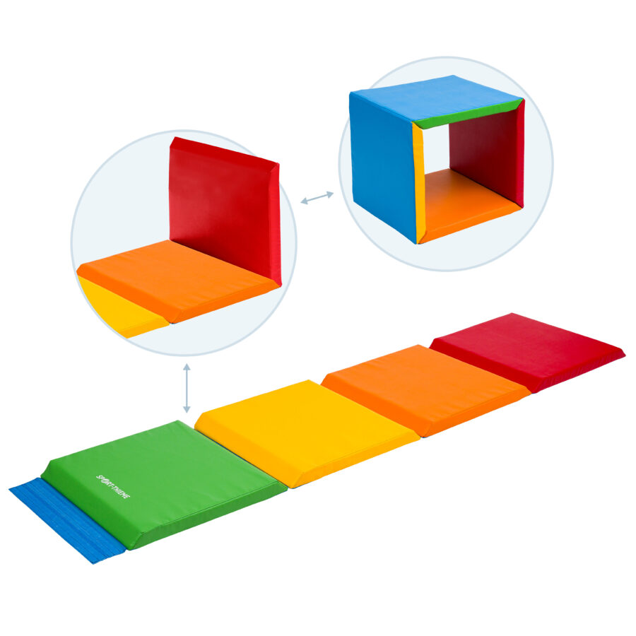 Diese lassen sich beliebig als Spielfläche oder durch Falten als Würfel und Tunnel verwenden. Dank Klett- und Flauschverbindung bleibt die Matte auch in gefaltetem Zustand optimal fixiert.