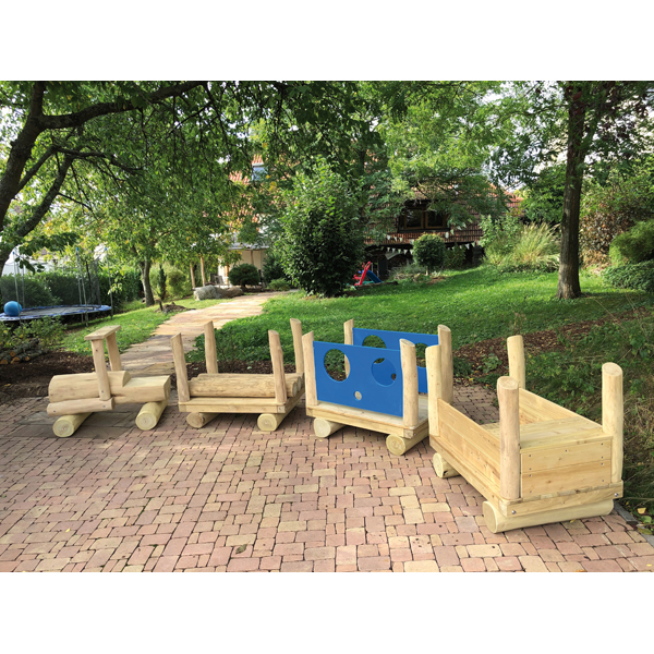 … Diese U3-Eisenbahn aus hochwertigem Robinienholz regt Kinder nicht zum Träumen an, sie animiert auch zum Klettern und Bewegen. In ihrer Fantasie reisen die kleinen Passagiere um die halbe Welt und erleben dabei spannende Abenteuer. Ideal überall, wo mehrere Kinder gleichzeitig miteinander spielen wollen. Der Zug besteht aus: 1 Lokomotive, 1 Waggon mit PE-Seitenwänden und Gucklöchern, 1 Waggon mit Stämmen, 1 Waggon mit 2 Treppenstufen und Edelstahl-Rutsche.